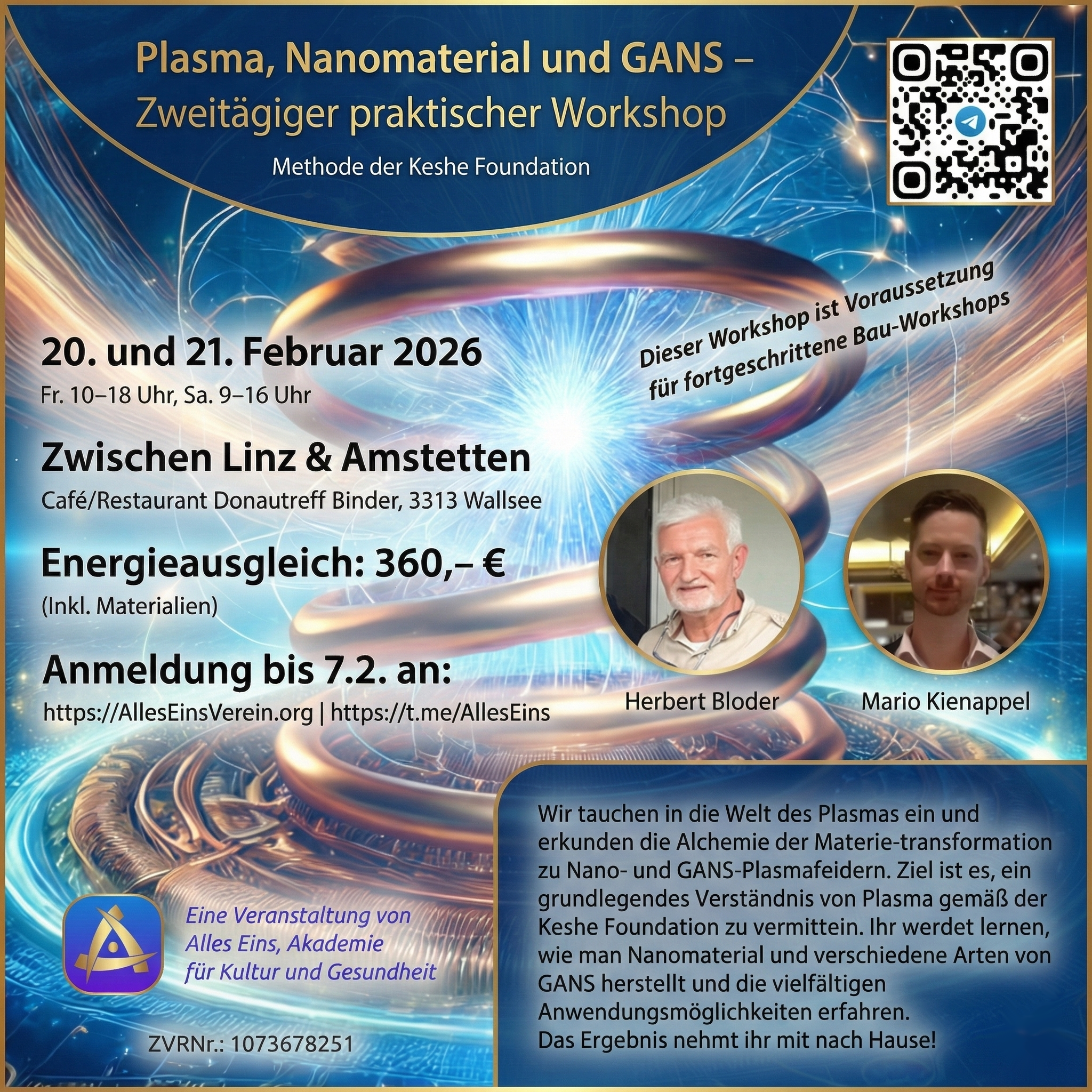 Am 20. & 21. Feb. 2025 vermitteln wir die Plasma-Basics nach Keshe und zeigen die Materietransformation zu Nano- und GANS-Feldern. Du lernst Nanobeschichtung und die Herstellung verschiedener GANS – plus einfache Anwendungsmöglichkeiten. Dein Ergebnis nimmst du mit nach Hause.